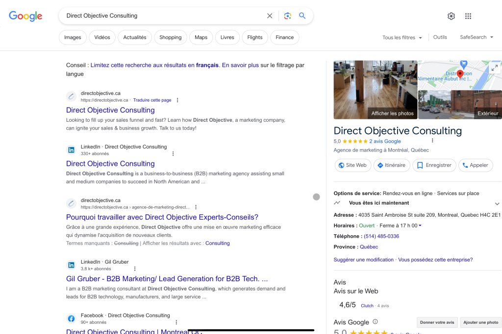 Google Knowledge Graph: when you search for a term such as “Direct Objective Consulting”, Google will display a box on the top right, providing all the key information about the company.